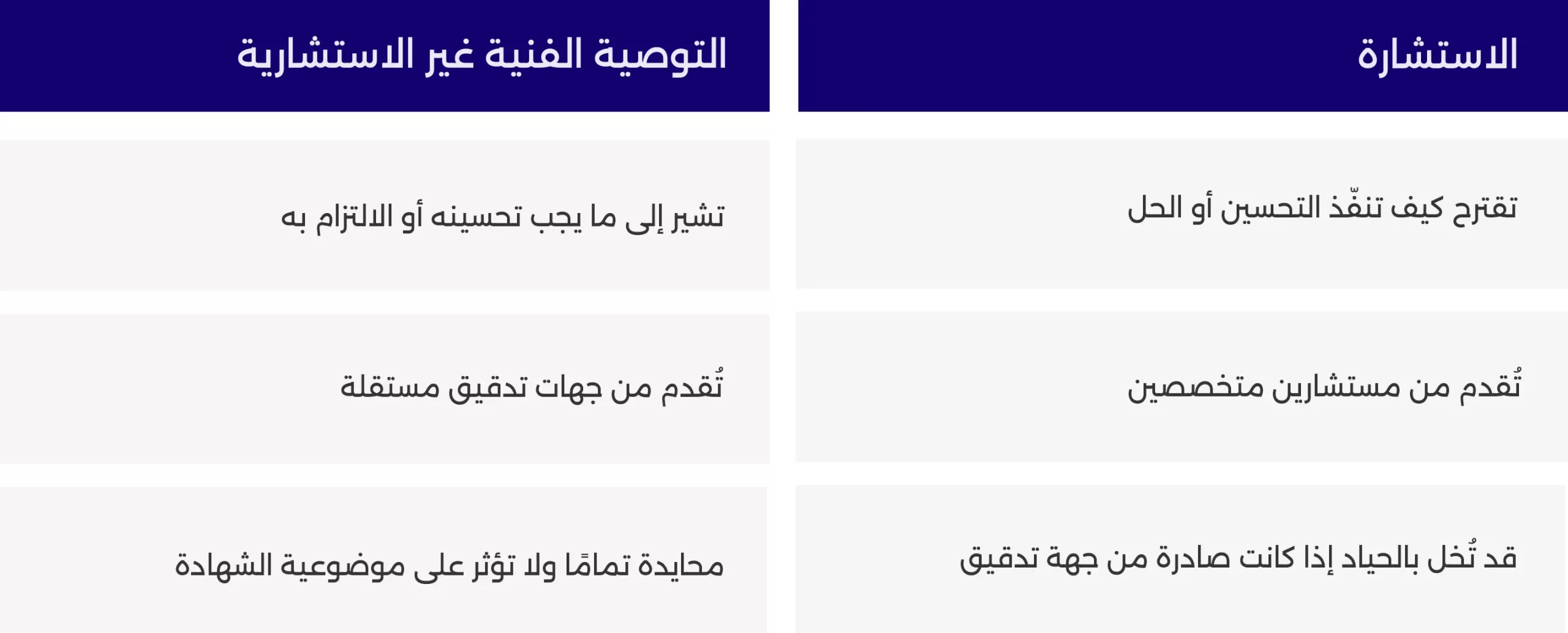 هي توصيات يقدّمها المدققون أو المقيمون الفنيون بعد تنفيذ التدقيق: • محايدة وغير ملزمة. • لا تتدخل في كيفية الحل أو التنفيذ. • لا تُعدّ نشاطًا استشاريًا، وإنما تعكس نتائج فنية تستند إلى الأدلة والمعايير.